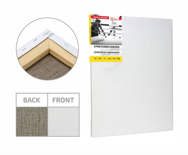 Полотно грунтоване щільність 370 грам на кв.метр на підрамнику виготовляється з 100% льону. Льняне полотно наділене міцністю та стійкістю до впливу вологи та температури, що гарантує довговічність виробу. Завдяки ручній роботі волокна не втрачають своєї форми, зберігається своєрідність зернистості полотна, що має важливе значення для живопису Проклейка-високоякісний желатин, три шари, грунт акриловий, три шари. Підрамник модульний клеєна сосна. Універсальність акрилового грунту дозволяє використовувати акрилові, олійні та інші види фарб.. Не містить шкідливих для здоров’я речовин. Безпечно при використанні за призначенням. Виробник: ROSA Україна