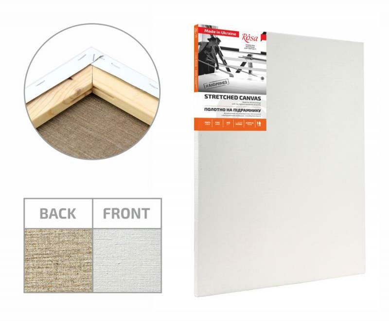 Полотно грунтоване середнє зерно, щільність 335 грам на кв.метр на підрамнику виготовляється з 100% льону. Льняне полотно наділене міцністю та стійкістю до впливу вологи та температури, що гарантує довговічність виробу. Завдяки ручній роботі волокна не втрачають своєї форми, зберігається своєрідність зернистості полотна, що має важливе значення для живопису Проклейка-високоякісний желатин, три шари, грунт акриловий, три шари. Підрамник модульний клеєна сосна. Універсальність акрилового грунту дозволяє використовувати акрилові, олійні та інші види фарб.. Не містить шкідливих для здоров’я речовин. Безпечно при використанні за призначенням. Виробник: ROSA Україна