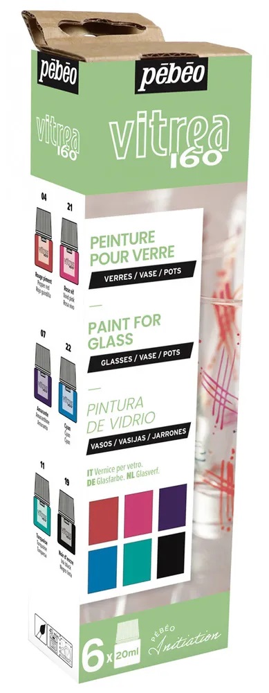 Набор глянцевых красок по стеклу (обжиг 160*)”Vitrea Открытие” Pebeo 6цвх20мл в картонной коробке. Краски для стекла, керамики, фарфора Vitrea160 на водной основе пластиковых баночках по 45мл. Образуют равномерно матовую или глянцевую поверхность. Краски Vitrea 160 прекрасно сочетаются и смешиваются между собой, образуя красивые оттенки. Экономны в расходе. Перед нанесением красок нужно обезжирить поверхность спиртом или мыльной водой. Нанести краску, затем просушить на воздухе в течение 24 часов. Закрепляются обжигом в домашней духовке при температуре 160*C в течение 40 минут. После полного остывания расписные предметы (посуду) можно мыть в посудомоечной машине при температуре не выше 70*С. Внимание! На некоторых видах стекла краски не держатся. Рабочие инструменты промываются водой. Не нагревать, не замораживать! Производитель: Pebeo(Пебео) Франция