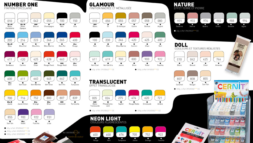 Полимерный моделин под обжиг в домашней духовке. Существует несколько серий, в зависимости от свойств. Все цвета моделина Cernit великолепно смешиваются друг с другом, а также с полимерными глинами других производителей. Работать чистыми руками на обезжиренной поверхности. Перед применением моделин следует тщательно размять. Гладкость придается пальцами, смоченными в холодной воде или через полиэтилен. Обжиг: нагреть печь до 90-130*С, поместить предмет на 5-30 мин, в зависимости от размера изделия. При минимальной температуре и длительном времени обжига – изделие будет более эластичным. При максимальной температуре – более твёрдым. После обжига Cernit становится достаточно прочным. Пластические массы содержат в себе масла и если вы не дообожгли изделие – оно будет недостаточно прочным, и вы можете столкнуться с проблемой “липкости” лака после его нанесения, хрупкости изделия. После обжига изделие можно шлифовать наждачной бумагой, обрабатывать резцом, сверлить, декорировать акриловыми красками и контурами, а также в технике декупаж. Готовые изделия можно покрывать специальными лаками для полимерного моделина CR-CE3050030001- CR-CE3050250003. Использовать только по назначению. Хранить моделин, упаковав в полиэтиленовую плёнку. Рабочие инструменты и руки мыть в тёплой мыльной воде. Не рекомендуется для использования детям до 3-х лет, во избежание проглатывания кусочков массы. Производитель:DARWI (Дарви) Бельгия