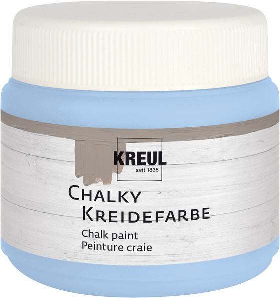 Густая краска Chalky Chalk на водной основе в пластиковой баночке 150мл. Краски прекрасно ложатся практически на все поверхности: на картон, дерево, глину, стекло, металл. Идеальна для пористых поверхностей, благодаря консистенции краска хорошо проникает во все углубления на поверхности. Наносить на очищенную и обезжиренную поверхность кистью или губкой. Краска быстро сохнет: один тонкий слой менее чем за 5 минут. После высыхания поверхность становится бархатисто-матовой. Краска очень укрывистая. Даже для светлых оттенков достаточно 1-2 слоев. Рабочие нструменты промываются водой. Не нагревать! Не замораживать! Производитель:Kreul (Кройль) Германия